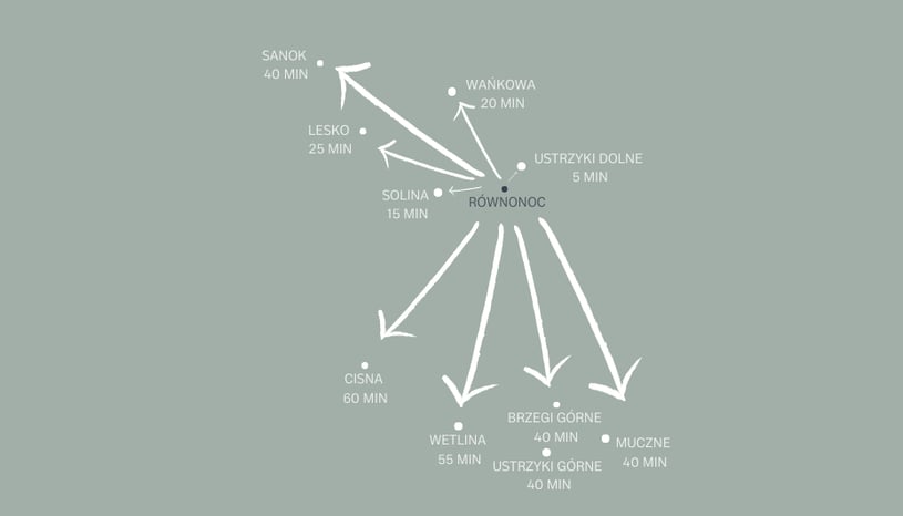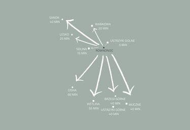 Domki znajdują się w miejscowości Równia pod Ustrzykami Dolnymi. Dostaniesz się z nich wygodnie zarówno do górskich szlaków, nad zalew Soliński oraz do sklepów. To wszystko pozwoli Ci się w pełni cieszyć wypoczynkiem w Bieszczadach.